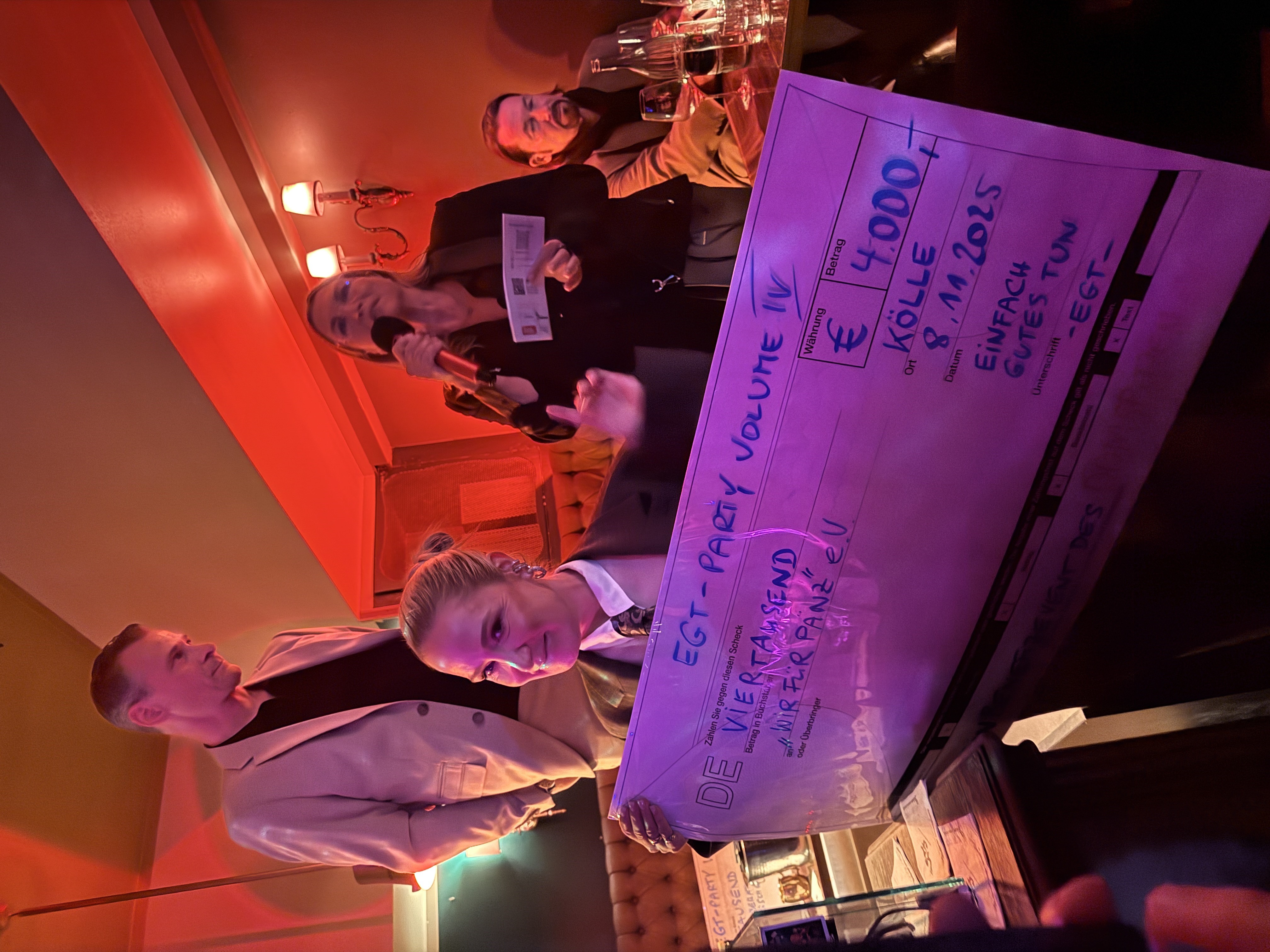 Einen Scheck über 4000 Euro konnte wir für pänz e.V. Geschäftsführerin Petra Gast von den Gründer:innen der Kölner Initiative EinfachGutesTun entgegennehmen. Die Charity-Party fand nun schon zum vierten Mal in Folge in der Kölner Friesenbar statt und war wieder ein voller Erfolg. Da die EGT-Initiative mit den Kölner Domspitzen kooperiert, überreichte Schauspielerin und Moderatorin Janine Kunze den großzügigen Scheck in ihrer Funktion als Botschafterin der Domspitzen. „Wir freuen uns sehr, dass EinfachGutesTun unseren Verein schon seit Jahren unterstützt“, bedankte sich Petra Gast im Namen der vom Verein betreuten Kinder bei den Organisitor:innen des Abends.