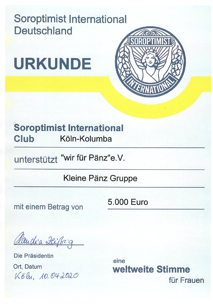 Mit 5.000 Euro unterstützt der SI Club Köln-Kolumba zum wiederholten Male die Eltern-Kind-Gruppen in Köln-Ostheim. Petra Gast, Geschäftsführerin von wir für pänz e.V., sagt mit ihrem Team ganz herzlichen Dank für die großzügige Spende. „ Unsere Kinder können jegliche Unterstützung gebrauchen und wir freuen uns über die kontinuierliche Hilfe der tatkräftigen Frauen von Köln-Kolumba“, so Gast. Überreicht wurde der Scheck aufgrund der Kontaktbeschränkungen im Zuge der Corona-Pandemie von der Club- Präsidentin Claudia Zeißig auf digitalem Weg.