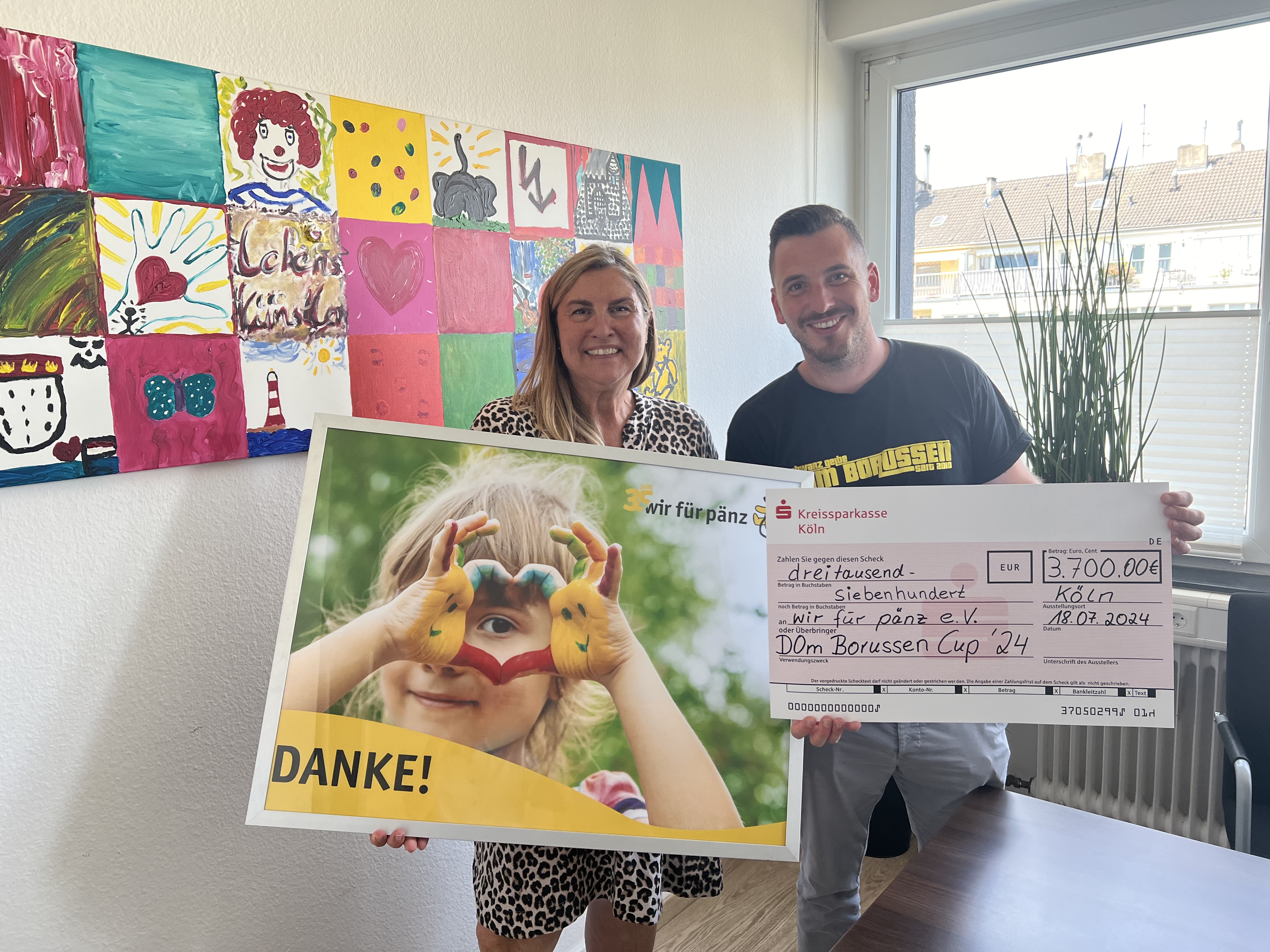Der Fanclub "Schwarz Gelbe DOm Borussen" hat den DOm Borussen Cup ausgespielt. Das Fußballturnier fand bereits zum fünften Mal in Köln statt. Patrick Wiegele übergab die stolze Spendensumme von 3.700 Euro an wir für pänz. "Wir freuen uns sehr über diese tolle Spende", so Petra Gast, Geschäftsführerin von wir für pänz e.V. Der Fanclub hat angekündigt, auch langfristig mit wir für pänz zusammenzuarbeiten.